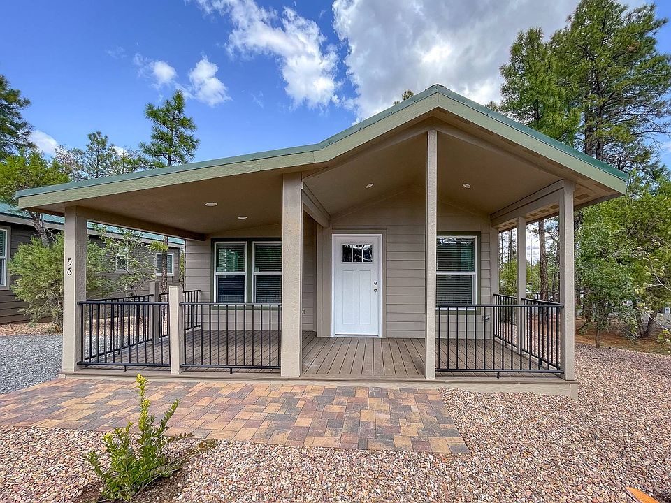 Inquire about new spec home incentives! Brand new! 2-bedroom, 2-bathroom! Many upgrades including a ceramic tile walk-in shower, large covered porch, living room addition, and zero-entry. This home is located in the most highly sought after 55+ community in Show Low. The site is a comprehensive lease. We have simplified your summer living experience by rolling up most of your utilities into a fee paid just once a year. Annual site fee covers your homesite as well as all of your water, sewer, trash service & internet. This allows you to save the cost of real estate taxes, HOA fees and year-round utility costs. The community is a 55+ Park Model community located in the tall pines of Show Low, Arizona. As a year-round community you can enjoy all four seasons of the White Mountains, imagine yourself enjoying the cool mountain air, shaded by the tall pines and watching the deer stroll through the forest, all while only one mile from major shopping, dining and state of the art medical facilities. An array of outdoor activities can be found nearby too. The community's Rules & Regulations prohibit the use of the home as a rental.