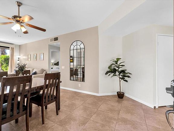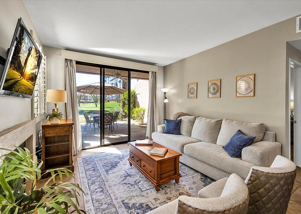 Discover the ultimate desert lifestyle in this stunning Vista AD floor plan home at Palm Valley Country Club, where panoramic golf course, mountain, and water views create an unforgettable backdrop. Perfectly situated along the 15th hole of the Challenge Course, this turnkey-furnished ground-level condo welcomes you with bright, open interiors and stylish renovations designed for effortless indoor-outdoor living. Lots of extra light from being an end unit.The updated kitchen features sleek quartz countertops, stainless steel appliances, recessed lighting, and a cheerful breakfast nook. The spacious living room flows seamlessly to the outdoor patio, where you can enjoy glistening lakes, manicured fairways, and colorful sunsets over the Santa Rosa Mountains. Vaulted ceilings and a gas fireplace add warmth and sophistication to the living area.The primary suite opens directly to the patio and offers a serene retreat, complete with dual mirrored closets, abundant linen storage, and a beautifully renovated spa-style bathroom with a large walk-in shower, built-in bench, and designer matte-bronze fixtures. The guest bedroom and bath are equally inviting, perfect for hosting friends or family. Additional conveniences include a laundry room and an attached two-car garage.Palm Valley Country Club is known as the ''Fun Club for All Ages,'' offering a vibrant social scene and resort-style amenities. Enjoy 47 sparkling pools and spas scattered throughout the community, a 100,000-sq-ft clubhouse with dining and lounge options, a state-of-the-art fitness center, lap pool, and a world-class spa and salon. Sports enthusiasts will appreciate two Ted Robinson-designed golf courses, 13 tennis courts, and 12 pickleball courts.Whether you're seeking a full-time desert retreat, weekend escape, or income-producing SHORT TERM RENTAL, this home checks every box. Ideally located near El Paseo's upscale shopping and dining and minutes from the BNP Paribas Open at Indian Wells Tennis Garden, this is desert living at its finest.Come experience the views, the lifestyle, and the energy that make Palm Valley Country Club one of the Coachella Valley's most beloved communities.