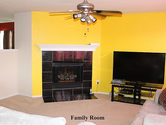 Impressive two story home with a floor plan that encompasses three spacious bedrooms with walk-in closets, formal living & dining area, stylish eat in kitchen adjacent to second living area with corner fireplace. Half bathroom and laundry room conveniently off the second living area. Custom lighting, designer accents walls and ceiling fans throughout. The second floor boast 3 split bedrooms separated by a well-appointed game room. Additional Comments: The owner is including custom lighting in the living room and dining room, refrigerator, washer & dryer, plus a wall mounted TV in the 2nd living area.