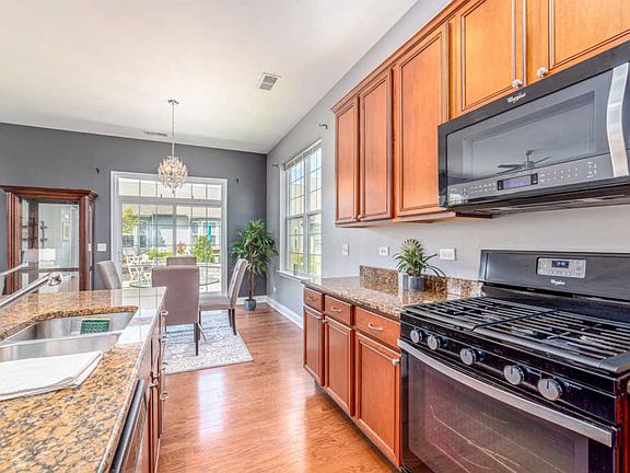 Step into this welcoming foyer with upgraded hardwood floors and tray ceiling, through to the open floor plan. Kitchen features 42" cabinets, huge island, granite counters, walk in pantry, and eat-in area with patio doors leading to brick paver patio. Expansive living room with extra large windows keeps the entire living area bright and welcoming. Master has tons of space, tray ceilings, private bath with separate toilet closet, dual vanities, and walk-in shower. 2 Car garage with separate doors and openers. Bowes Creek Community offers access to Club House, swimming pool, tennis courts, exercise room and walking paths.