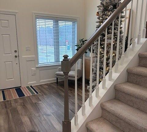 This townhome offers a perfect balance of hardwood floors on the main level, providing a touch of sophistication, and plush carpets upstairs for comfort.