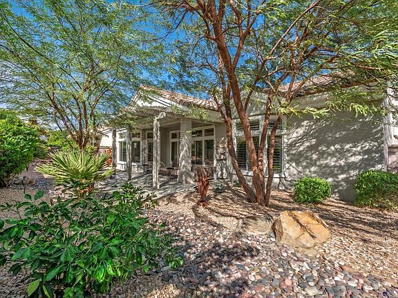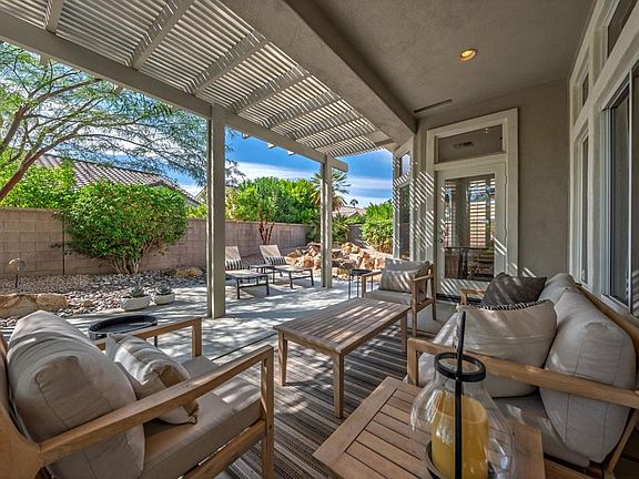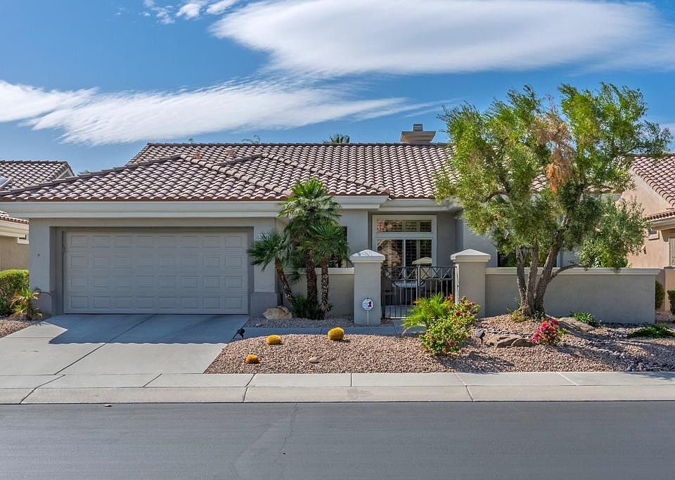 Sun City Palm Desert - Lenox. This beautifully updated Lenox model is move-in ready and exudes modern desert charm. Inside, luxury vinyl plank flooring is featured throughout, with tile in the bathrooms. Ten-foot ceilings and transom windows create a bright, open atmosphere. Upgraded lighting, fans, hardware, baseboards, and plantation shutters enhance the home's fresh, contemporary feel. The living room offers a cozy gas fireplace with a marble tile surround and a spacious media niche. The kitchen showcases quartz countertops, a subway tile backsplash, stainless steel appliances, and an upgraded sink and fixtures. Just off the living room is a versatile den or office. The primary suite features a bay window and a large walk-in closet. Its bathroom includes 12''x24'' tile flooring, a glass-enclosed stall shower, and a quartz-topped vanity with dual sinks, updated fixtures, and mirrors. The guest bathroom is similarly upgraded and includes a tub/shower combination. The laundry room provides generous storage space, and the two-car garage includes a convenient golf cart nook. Additional upgrades include a new top level air conditioner & furnace installed in 2024. Curb appeal abounds with an updated exterior paint scheme and a gated front courtyard. The rear yard offers an extended patio, alumawood patio cover, and a soothing water feature surrounded by lush desert landscaping -- the perfect setting for relaxing or entertaining