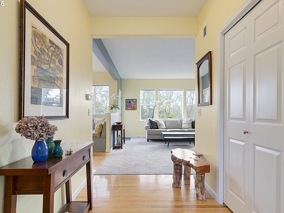 Discover the perfect blend of elegance and comfort in this South Eugene gem, a Northwest Contemporary designed to celebrate its lush surroundings and stunning views. The open-concept main level is a haven of light and space, featuring a cozy living room with a gas fireplace, expansive east-facing windows, and access to an upper deck for morning coffee or evening relaxation. The gourmet kitchen is a chef’s dream, showcasing hardwood floors, quartz countertops, a downdraft range oven, stainless steel appliances, and filtered views of trees and distant hills. Entertaining is effortless with a formal dining room that offers a built in credenza and seamless access to the kitchen. Retreat to the upper-level primary suite, a private sanctuary perched in the treetops with private and breathtaking views. This luxurious space boasts a huge walk-in closet and a thoughtfully remodeled spa-like bathroom with a soaking tub, separate shower, and elegant finishes. A secret bonus room off the bathroom offers endless possibilities—an office, serene studio, nursery, or cozy reading nook. The lower level is designed for versatility and relaxation, featuring two full bedrooms and a full bathroom, a bright family room, an additional bonus space perfect for a game room or sitting area, and access to a lower deck with a hot tub, and places to sit out of the sun. Step outside to enjoy the fully fenced yard with raised garden beds, sitting areas, and plenty of room to explore and watch the wildlife. There is so much space to keep all those extra items, holiday decorations and more with additional space in the mechanical room, and an oversized two-car garage. Don't miss the under the stairs...a perfect spot for a child's play space. This home is the ultimate retreat, combining thoughtful design, modern comforts, and a tranquil connection to nature. Come see for yourself!