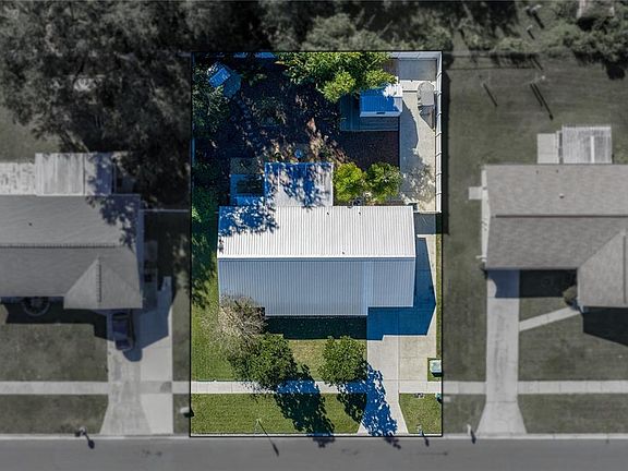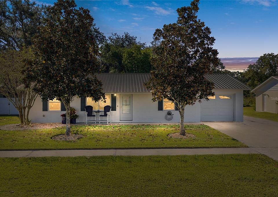 Set on a charming Zephyrhills street close to everyday hotspots, this 2 bedroom, 2 bath, 1 car garage home brings a cozy cottage farmhouse vibe together with a wonderfully functional layout, and thoughtful upgrades, including a 2020 metal roof and 2021 AC. The white painted brick exterior pairs beautifully with mature trees and tidy landscaping, while the added RV parking pad, 30-amp RV plug, and fully privacy-fenced yard make the property as practical as it is inviting, all with no HOA. Step inside to a warm, welcoming interior where luxury vinyl plank flooring runs throughout the main living areas and tile highlights the wet areas. The living room balances roominess with comfort, flowing naturally into the dining area and updated kitchen. Crown molding, a charming chandelier, and sliding door access to the Florida room give this central living space its signature character. The kitchen, refreshed in 2023, features a stainless steel appliance package, upgraded countertops, a classic backsplash, and upgraded hardware that adds just the right touch of personality. The split layout keeps the primary suite tucked away, offering a spacious bedroom, a walk-in closet with built-in organizers, and an ensuite bath with an updated vanity, wainscoting, and a tub/shower combo. Across the home, the secondary bedroom sits near a second full bath, also updated and featuring a tub/shower combo. The oversized garage houses the washer and dryer, keeping noise and heat out of your main living areas. Peaceful Florida living awaits outdoors with an enclosed Florida room enhanced in 2019 with double pane windows, a ceiling fan, and stone tile flooring that invites year-round enjoyment. The low-maintenance backyard is an easy place to unwind at the end of the day with its relaxing swing, deck around the shed, and tall clumping bamboo that adds greenery without overwhelming the yard. Notable improvements include a 2020 metal roof, 2021 AC, 2023 kitchen update, interior ceilings and crown molding in 2025, windows and doors replaced in 2015, flooring in 2018, enclosed porch upgraded in 2019, and fresh interior and exterior paint in 2019. A home this charming and well cared for, in such a convenient Zephyrhills location and with no HOA, is an exciting opportunity! Schedule your showing today and see why this one stands out.