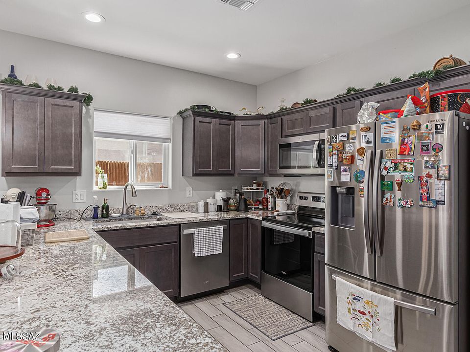The search is finally over! You'll absolutely love to own this full-fenced 3-bedroom residence in Tucson! Inside, the inviting great room sets the tone of a delightful living experience, enhanced with wood-look tile flooring throughout. Spotless kitchen comes with recessed & pendant lighting, plenty of espresso cabinets with crown moulding, stainless steel appliances, granite counters, and a convenient breakfast bar. In the perfectly sized primary bedroom, you will have a private bathroom with dual sinks and a floor-to-ceiling tiled shower. Create lasting memories in the sizable backyard offering artificial turf. Excellent location, close to restaurants, schools, parks, and entertainment. This amazing deal won't last long. VA assumable loan!! Make it yours before it's gone!