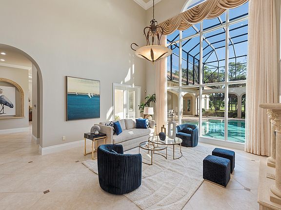 Behold the pinnacle of modern elegance that lies within Isla Del Sol in the award-winning Fiddler's Creek! This 4 bed + den, 4 ½ bath home provides breathtaking views of the pool and golf course. The entire home immediately stands out with stunning accents and exquisite detailing that includes soaring ceilings, a grand staircase, fireplace, tray ceilings, and more. An enormous corner slider opens to the screened-in patio from the kitchen and living room, providing easy access to the screened-in custom pool & spa! Culinarians will be impressed in the kitchen with gas cooking, top of the line appliances, walk-in pantry, granite countertops and a Butler's pantry. Wine connoisseurs will love the custom wine room and wet bar that has plenty of space for liquors and wines alike! The master bedroom provides access to the lanai, a sitting area, and an en-suite with dual vanities and large walk-in shower. Upstairs showcases 2 guest bedrooms, each with their own full bath, and a balcony overlooking the pool and golf course! The award-winning community of Fiddler's Creek offers luxury amenities including a resort-style pool, restaurants, fitness, tennis, pickleball, bocce and more.
