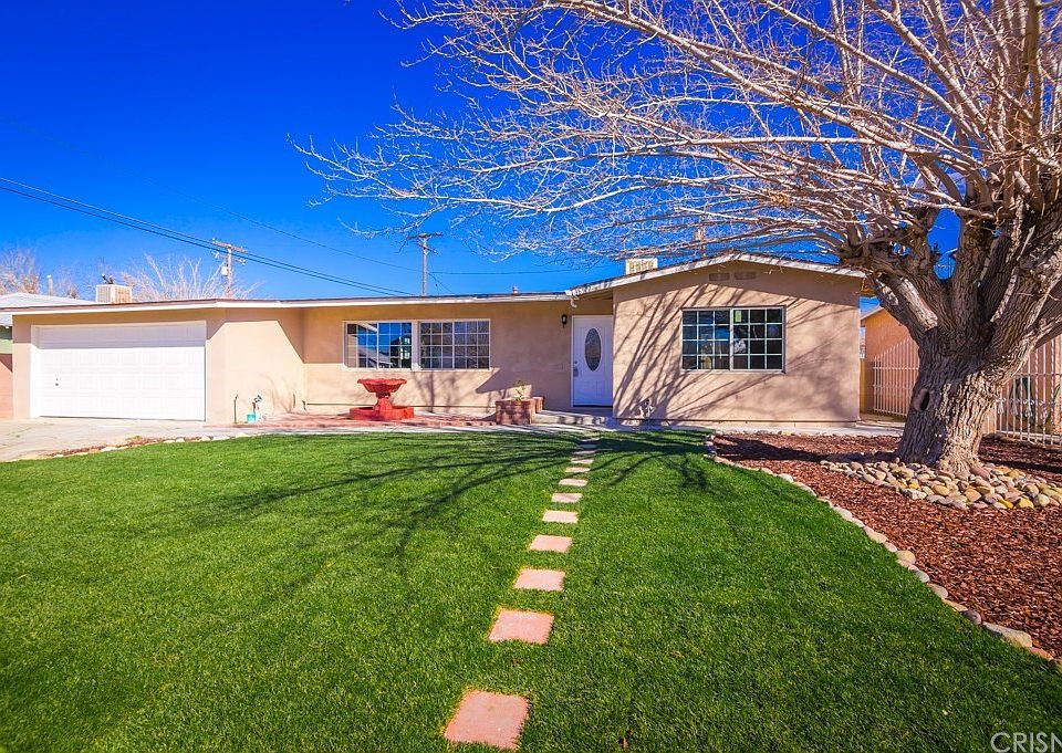 Tasteful Must-See Palmdale MARRO Home! Home will WOW buyers! New Exterior and Interior custom modern paint, Newly laid sod in front yard and nice brick walkway with a beautiful fountain and New front door. Breathtaking Kitchen displays New diamond laid gray tiled flooring, New white cabinets with New modern stainless steel hardware, new granite counter-tops, New Stainless Steel Appliances to include: Refrigerator, Dishwasher, and Gas Stove. Living Room features New dark laminate flooring, New baseboards, New recess lighting, and New chandelier light in the dining area. Guest Bathroom displays New diamond laid gray tiled flooring, New white vanity with marble counter-top, New gray tiled shower, New decorative mirror, and New light fixture. All bedrooms feature new paint, new carpet, mirrored closet doors. Laundry room also displays, New tiled flooring; bathroom off laundry area displays New diamond laid gray tiled flooring, New custom tiled shower, New Oval mirror, and New light fixture. The hallway has New carpet and New coat closet with mirrored closet doors. Off of kitchen, you have door access which leads to back enclosed patio with tiled flooring, nice yard and storage shed.
