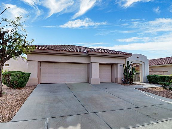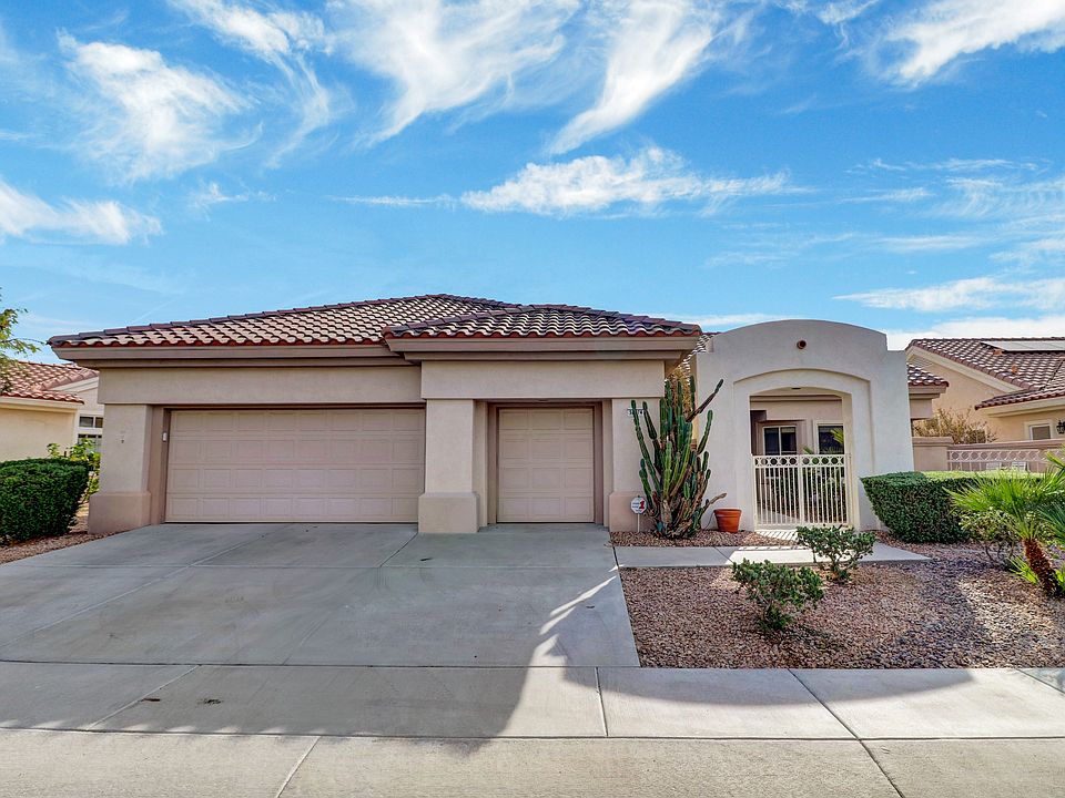 Annual lease in Sun City, the premier 55+ community in Palm Desert. This rare Solitair model has over 2100 square feet with 12 foot ceilings, a kitchen family room combination and breakfast nook overlooking the private park like fully fenced back yard. Nicely landscaped rear patio with shady covered area. Brand new decorator paint, coordinated new carpet, and wood look tile floors in all traffic areas. The huge garage is bigger than some houses with a wall of cabinets, storage shelves and an extra fridge included. The large laundry room has a wet sink and even a garden window for your indoor plants. Formal Living/Dining room with special ceiling touches and another view of the yard and patio. The primary bedroom with massive organized closet and private zen patio, large shower and jetted tub compliment the double sink/make up table. The guest wing has a beautiful front den/study/bedroom overlooking the front courtyard, With a bathroom and linnen closet between another bedroom overlooking the rear patio with a fantastic custom closet. Ceiling fans throughout dual AC recently replace for trouble free comfort. Titanium Security maintains the complex with three 24/7 patrol vehicles in addition to front and rear maned gates in addition to 3 automated entrances. This home is just a walk away from the remodeled clubhouse, tennis and pickleball courts and the outdoor sports pavilion. Three clubhouses, 4 pools (one indoor) two fully equipped fitness centers one with an indoor track for year round exercise keep you in shape. Two championship golf courses, two pro shops, 20 station driving range (balls included), world class practice facilities, and a natural grass putting course rounds out the golf. 80 clubs that will keep you busy, three restaurants (one is a brand new sports bar) to keep you happy and well fed, a 200 seat movie theatre and a 600 seat playhouse/ballroom with entertainment fit for royalty. Be as busy as you like or enjoy the ultimate relaxing home and yard. Welcome
