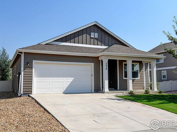 Welcome to this beautifully maintained 3-bedroom, 2-bathroom home in Harvest Village/Boxelder Commons. New carpet throughout. The open-concept Ranch floor plan features rich laminate flooring, alder cabinets, a granite counter tops, kitchen island, and upgraded window blinds. The private primary suite offers a tray ceiling, large walk-in closet, and en-suite bath. Two additional bedrooms also include walk-in closets, providing plenty of space and flexibility. A full unfinished basement offers endless potential to expand or customize. Enjoy a spacious yard and an oversized 2-car garage-ideal for extra storage or hobbies. Neighborhood amenities include HOA-covered exterior irrigation water and access to the community pool.