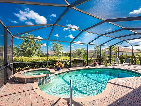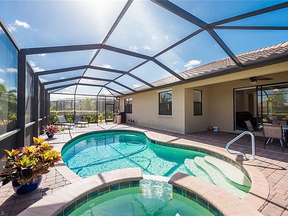 Luxurious 3 bedroom / 2 bathroom open floor plan home with beautiful pool and lake views at a GREAT PRICE! Granite kitchen with tons of cabinets and counter space, multiple eating areas and stainless steel appliances. This open floor concept flows from the kitchen to the living room and then on to your outdoor area which includes a screened pool and spa. Tile on the diagonal throughout the entire home as well as crown molding throughout. Master suite offers an over sized walk in closet and the master bath offers dual sinks, a shower and separate soaking tub. Live maintenance free with low fees that include lawn care, irrigation and basic cable. Huge 3 car garage. Copper Cove is a gated community close to everything Naples and Marco Island have to offer.