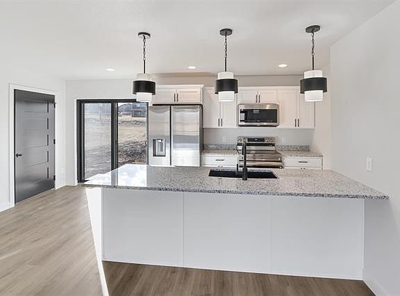 Sprinkler systemGranite countertopsNice deckPatio doorFresh sodOverlooks the backyardOpen concept