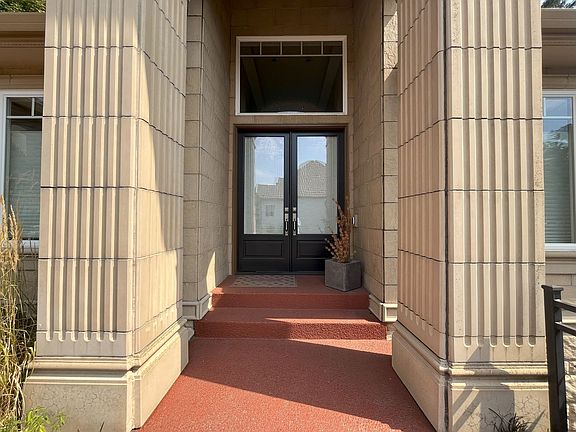 As you arrive, you're greeted by a beautifully landscaped front yard with lush grass, manicured shrubs, and a graceful Japanese maple tree. A covered walkway framed by pillars leads to a striking glass entry door, setting the tone for the luxury within.