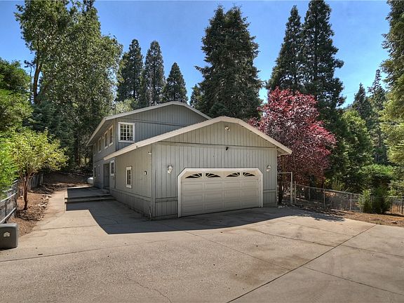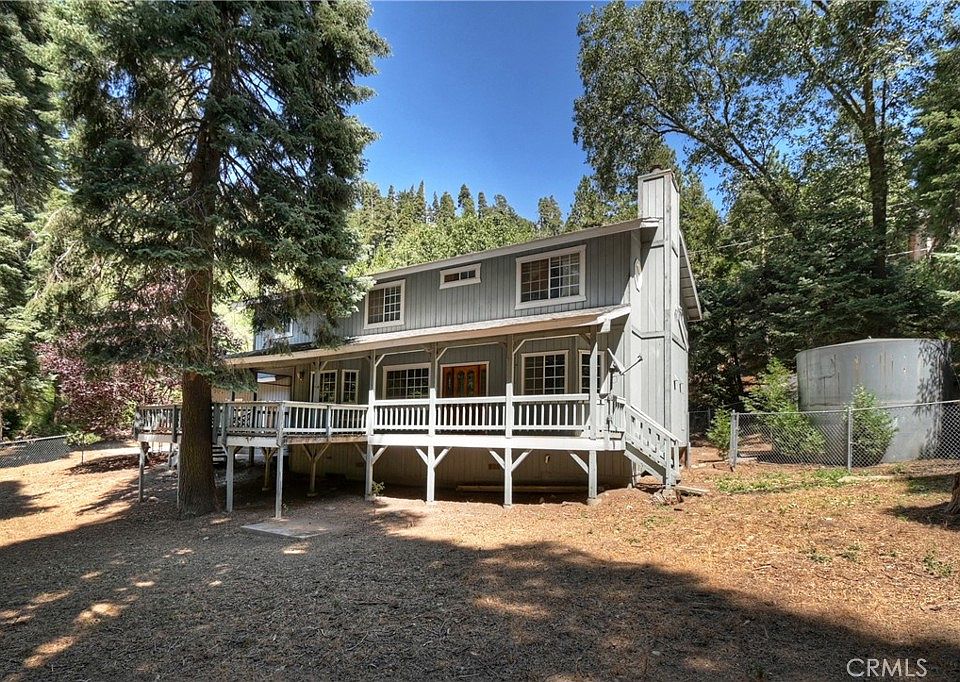 This diamond in the rough is located in one of the best neighborhoods in Cedarpines Park. You enter through a large, covered deck that looks over the yard. The open concept living room-dining room combo has an attractive rock fireplace focal point with shelves on either side. The kitchen is huge and includes a double oven, center island and stainless appliances. On the main level there are two bedrooms that are down a hall that could be a private suite. Plus, a large laundry room. Upstairs are the rest of the bedrooms and a family room. The primary bedroom is huge and has its own wood stove, full bath and large walk-in closet. The house sits on a lot over an acre. A large portion of the lot is fenced and level. Plus, it has dual access off Sawpit Canyon Road or Garden. This property has a highly desirable gravity fed well. A little polish and this one could really shine.
