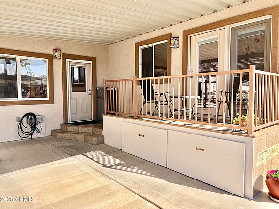 RARE find in a Fun-Filled 55+Community! This BEAUTIFULLY updated park model home has EVERYTHING you've been searching for-location, style and comfort all wrapped into one MOVE IN READY HOME! Step inside and FALL IN LOVE with the INVITING 1 bedroom, 1.75bath layout, complete with a Cozy Arizona room & BRIGHT, OPEN front living space. The home FEATURES A gorgeous STUCCO exterior, excellent curb appeal, a spacious carport and a South facing deck, perfect for soaking up Arizona's sunshine!The STUNNING kitchen shines with CUSTOM-PAINTED white cabinetry, NEW GORGEOUS MARBLE COUNTERTOPS. BLACK APPLIANCES & EVEN A FULL SIZE DISHWASHER- a RARE PERK! A true chef's delight. Throughout the home you will find NEW VINYL PLANK FLOORING, TEXTURED WALLS, NEW WINDOW SHUTTERS &. thoughtful touches TOP TO BOTTOM! In the Arizona room, you'll love the added bathroom featuring a WALK IN SHOWER. GENEROUS VANITY SPACE & NEW 2025 PROFILE COMBO WASHER/DRYER! Your guests will appreciate having their own private bathroom -a true luxury in park model living!The main bathroom has a STUNNING CUSTOM TILED WALK IN SHOWER w/ glass doors, upgraded vanity w/marble countertops & nice storage space! MAJOR UPGRADES INCLUDE2013 NEW RUBBER MEMBRANE ROOF on park model,2015 NEW 3-TON A/C UNIT & DUCTWORK, DUAL PANE WINDOWS, 2015 complete bathroom remodel & BRAND NEW 30gallon water heater! Additional highlights include ceiling fans throughout,RO drinking water system, NEW gutters & EXCEPTIONAL ATTENTION TO DETAIL everywhere you look! This home has been METICULOUSLY MAINTAINED-there's simply too much to list! FURNISHINGS include SMART TV, SOUNDBAR & ELECTRIC FIREPLACE. Everything is ready for you to move right in-no projects, no worries! This GEM is a MUST SEE RARE, ONE OF A KIND home! OWN THE LAND...OWN THE FUN!