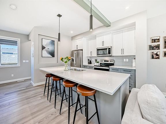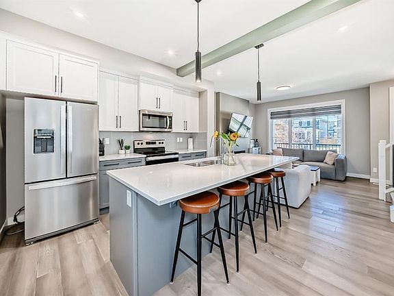 ** OPEN HOUSE, Saturday November 22nd, 1-3PM ** Welcome to this beautifully upgraded single-family detached home, perfectly combining modern style and everyday functionality. Step inside to find a spacious, open-concept layout featuring soaring 8-foot interior doors and high-end finishes throughout. The kitchen is a true showstopper with sleek quartz countertops, stainless steel appliances, and beautiful cabinetry—ideal for both cooking and entertaining. Relax in the cozy living area, complete with a contemporary electric fireplace that adds warmth and ambiance. This home offers three generously sized bedrooms, including a luxurious primary suite with a bit of a mountain view, a full ensuite and a large walk-in closet. The unfinished basement comes with a bathroom rough-in, offering endless potential to create the space you need. Outside, enjoy a beautifully landscaped yard, a back deck perfect for BBQs, and an oversized, insulated garage with plenty of room for vehicles, storage, or a workshop. Located in a vibrant and convenient community, you're just steps away from schools, walking paths, parks, and the nearby Trading Post commercial area, featuring restaurants, a convenience store, dental office, pharmacy, bakery, and more. This home truly offers the perfect blend of comfort, style, and location.