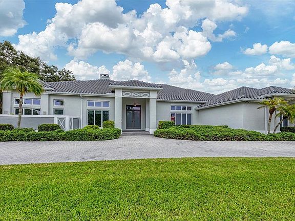 Set on a serene half-acre homesite in Prestancia, this single-story residence combines timeless architecture with a floor plan designed for both elegance and ease. A circular paver drive framed by manicured lawns, tropical palms, and a landscaped center island leads to a crisp, bright front elevation recently enhanced by a new roof completed in 2024. Wide steps and column accents mark the approach to a grand double-door entry, where soaring ceilings and abundant natural light immediately set the tone. Throughout the home, nearly every room is graced with transom windows, volume ceilings, and smooth-finish surfaces creating an airy, light-filled environment. The heart of the home is its expansive great room, anchored by a stone fireplace and complemented by a custom entertainment wall, a built-in bar, and generous shelving, an ideal space for gatherings and everyday relaxation. Pocketing glass doors open to the lanai, where covered dining and lounge areas flow seamlessly to the screened pool terrace. Here, a sparkling pool with a raised fountain and cascading water feature creates a tranquil backdrop, surrounded by lush landscaping. The kitchen offers generous refrigeration capacity, double ovens, abundant cabinetry, and a built-in desk station, ensuring both function and opportunity for future customization. A breakfast nook with cabinetry opens directly to the lanai, making casual meals feel like part of the indoor-outdoor experience. The private primary suite is a true retreat, offering soaring ceilings, space for a sitting area, direct lanai access, and a well-appointed office with garden views, situated for privacy and convenience. The spa-inspired bath includes dual vanities, a makeup counter, a soaking tub, and a curved walk-in shower with dual showerheads. Two guest suites with ensuite baths provide comfort for family or visitors, one of which also serves as a pool bath. A powder bath just off the foyer, a well-appointed laundry room, and a side-entry garage complete the layout. With 4,131 square feet of living space, this 3-bedroom, 3.5-bath home balances comfort and entertaining within one of Sarasota’s most prestigious gated golf course communities. In Prestancia, residents enjoy optional TPC memberships with golf and social opportunities, plus convenient access to The Legacy Trail, Siesta Key Beach, downtown Sarasota, St. Armands Circle, and the barrier islands.
