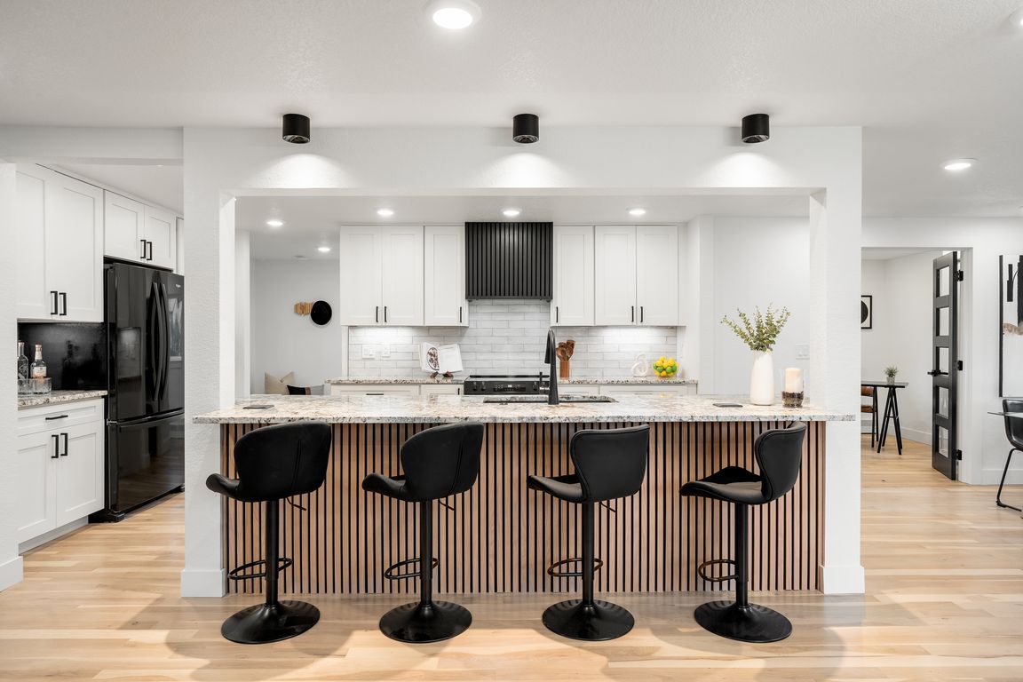 - Description: Thoughtfully Remodeled Chef’s Kitchen With Granite Countertops, New Appliances, Glossy Ceramic Subway Tile, Classic Shaker-Style Cabinets With Contemporary Hardware, A Walk-In Pantry, And A Custom Slatted Range Hood Cover, Anchored By A Large Central Island With Cohesive Vertical Slat Trim