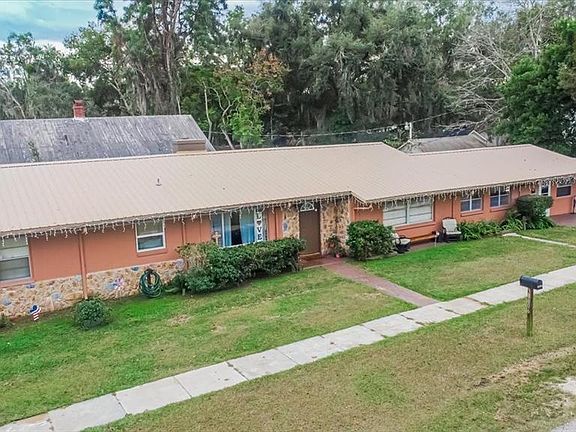 Introducing a spacious and beautifully maintained midcentury modern home ideally located in historic downtown Zephyrhills, just a short stroll from the shops, dining, and community events along Main Street. This charming block home offers a blend of classic character and thoughtful updates, beginning with a 1/8 of an acre corner lot. The home features luxury vinyl plank flooring throughout, plenty of windows, wood burning fireplace and a plethora of home features that need to be seen in person to truly appreciate. The kitchen features an original all wood cabinetry, white appliances, a deep double sink, wood planked ceiling, and a generous walk-in pantry. You’ll love how the kitchen opens seamlessly to the living room with built-ins shelving and the continued wood plank ceilings create a warm and inviting atmosphere that only a home that has been well loved delivers. The adjoining dining room includes a beautiful wood burning fireplace, LVP floors, and direct access to the main living area and the homes four bedrooms. The primary bedroom suite features LVP flooring, dual walk-in closets (including one oversized with a closet system), and an en suite bath with a tiled walk-in shower and bench. Three additional bedrooms offer ceiling fans, LVP flooring, and convenient overhead storage. This home also features a block framed safe room inside the primary bedroom closet. The additional three bedrooms have ceiling fans, closets with additional storage above closets and the beautiful luxury vinyl plank flooring. A second full bath includes a ceramic tub/shower with tile walls and floors, a cultured marble countertop, and natural light from a thoughtfully placed window. The expansive 20x11 Florida room enhances the home’s livability with tile flooring, cathedral ceilings with exposed beams, seven surrounding windows, a 2023 window A/C unit, and two exterior doors leading outdoors. Picture yourself enjoying this space at the end of a long day. This room will definitely be one of your favorite cozy spaces in your new home. The property continues to impress with a covered 20x10.5 outdoor living space (built in 2019) featuring a metal roof, tiled flooring, and a custom cedar bar that is perfect for relaxed entertaining. Additional highlights include a metal roof on the home, gutters, fenced yard, detached storage shed, and exterior security lighting. With its prime location near downtown and timeless architectural charm, this home offers an exceptional opportunity to enjoy both the historic character and walkable lifestyle of Zephyrhills. Don’t miss your change to own this beautiful home. NEWER A/C (2024) All room sizes are approximate. Washer, dryer and Refrigerator do not convey.
