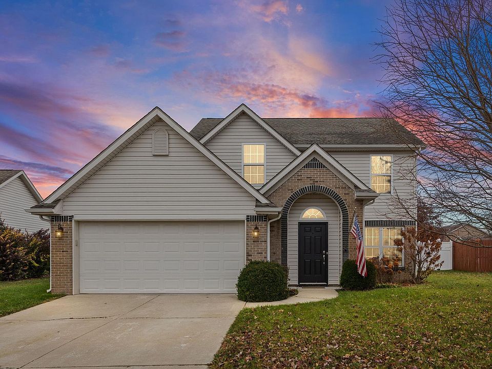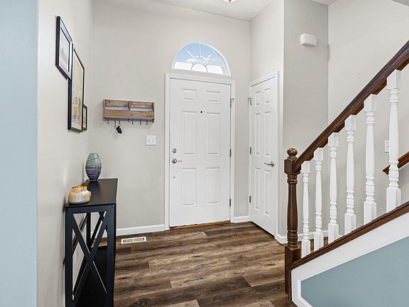 Beautiful two story home in the highly desirable Stones Crossing neighborhood offering four bedrooms and two and a half baths. The main level features new luxury vinyl plank flooring throughout, fresh custom paint, and an inviting eat-in kitchen with bright white cabinetry, a stylish tile backsplash, stainless steel appliances including a newer dishwasher, and updated lighting that gives the space a warm, modern feel. The living room, currently being used as a formal dining room, showcases a cozy gas fireplace, custom cabinetry, and large windows that fill the home with natural light. A convenient half bath and laundry room are also located on the main level. Upstairs, the spacious primary suite provides a true retreat with its own gas fireplace, luxury vinyl plank flooring, an ensuite bath with dual vanities, and a generous walk-in closet, and private outdoor deck. Three additional bedrooms and another full bath complete the upper level and offer plenty of space for family, guests, gym, or a home office. Outside you will find a two car garage, a large yard with a full privacy fence, and irrigation in both the front and backyard, perfect for easy maintenance. Additional recent updates include a new water heater, smart thermostat, and improved landscaping. Ideally located near top rated schools, shopping, restaurants, and major local employers.