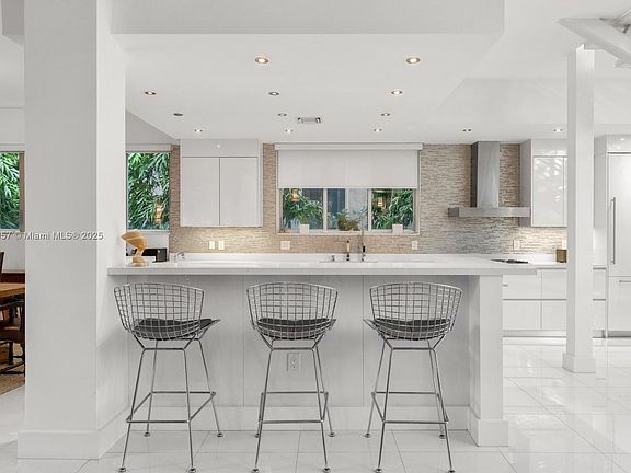 Designed by architect D.B. Lewis, this gated 2017 contemporary home in Coconut Grove offers a spacious layout ideal for entertaining. A dramatic three-story atrium greets you on entry, anchored by two mature oak trees. The lower level features a seamless indoor-outdoor flow and a chef’s kitchen with a gas Gaggenau cooktop and Miele and Viking appliances. Five en-suite bedrooms include a private primary wing with lounge, spa-style bath, and windowed walk-in closet. A 1-car air-conditioned garage and driveway space for three more vehicles add convenience. The rooftop retreat boasts a pool, gazebo, and cabana bath.