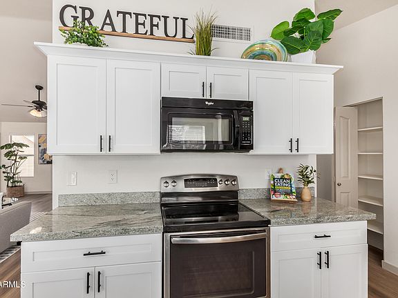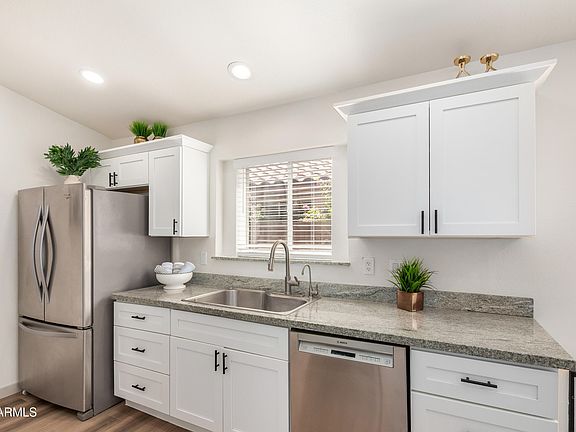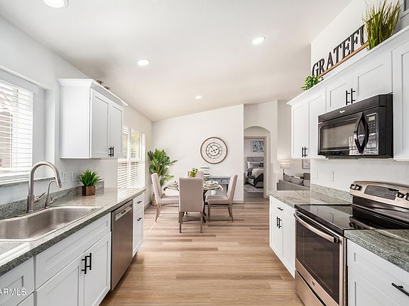 Inspection completed! Gorgeous, remodeled and move in ready home in the heart of Gilbert! New floors, fresh paint, baseboards, doors, molding, blinds, and with a newer roof (2021). Tucked away in Carol Rae Ranch, this spacious, split floorplan blends comfort, style, and charm. Step inside to find an open, light-filled floor plan with vaulted ceilings, stylish finishes, and plenty of room to gather or unwind. The galley kitchen offers modern touches with ample cabinetry and counter space, flowing seamlessly into the living and dining areas—perfect for entertaining.