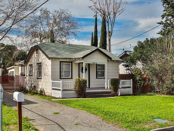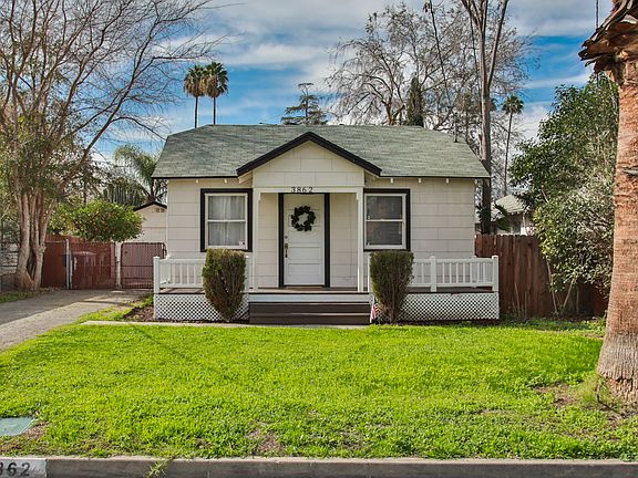~ Text 3862 Everest to 59559 for more details ~ This quaint bungalow style 2 bedroom, 1 bathroom home is BIG on character! Sitting on a 6,970sqft lot, this charming farm house styled home features a comfortable family room with laminate wood flooring that flows through the entire home. The faux shiplap accent wall runs through to the rustic farm house inspired kitchen that features beautiful dark stained wood countertops with eggshell white cabinets, brushed nickel hardware and open country style wood shelving. Subway tile backsplash and modern stainless steel stove, vent and recessed lighting bring modern touches to this space. The eating area is just off the kitchen with direct access to the side yard. The farmhouse style flows through to the bathroom with country style wood furniture style countertop, hexagon tile flooring and subway tile step in shower. The shiplap accent wall flows through to the spacious master bedroom with rock faced wood burning fireplace with built in white shelving and mantle. The washer & dryer are conveniently located in the closet. The attached enclosed patio is currently used for more storage and as a closet and has so many possibilities. The 1 car detached garage is set back behind the gate offering more privacy and security. The backyard is a blank slate with plenty of room for later additions, pool, or play set. Located close to the 91 frwy , Cal Baptist University, and shopping, this home is a must see.