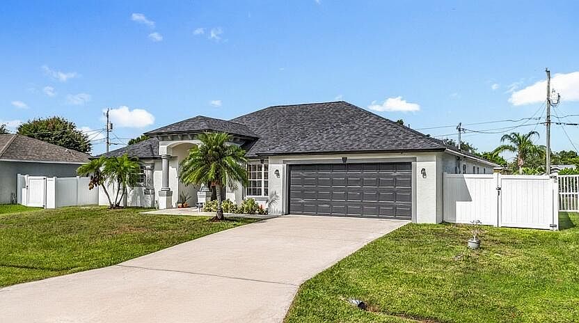 Spectacular 4 bedroom 3 FULL bath home on the west side of Port St Lucie. Solid CBS construction with BRAND NEW roof installed in 2024! Great location, close to Tradition shopping but NO HOA fees! This beautiful home has vaulted ceilings and crown molding. The kitchen is wide open and has real wood cabinets and granite counters. NO carpet, diagonal tile in the main areas and upgraded wood laminate in the bedrooms. The AC is also NEW installed late 2024! Last is the huge back yard, all fenced with white PVC and comes complete with mango trees! Don't miss out on your chance to own this piece of Florida paradise!
