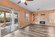 Low-maintenance landscapingSpacious and functional layoutMature palm treesCovered patioVaulted ceilingsImpressive two-story ceilingsCozy fireplace