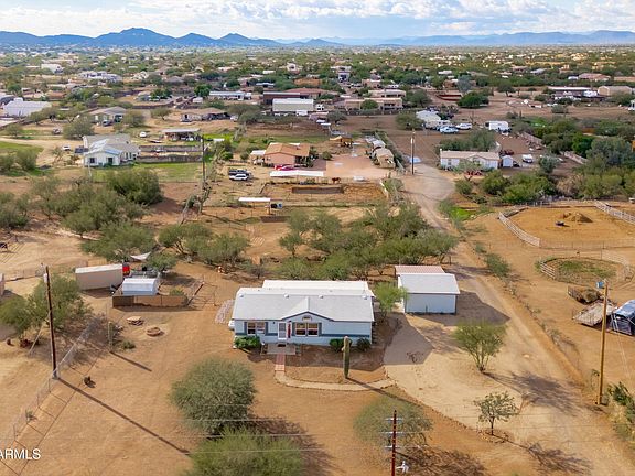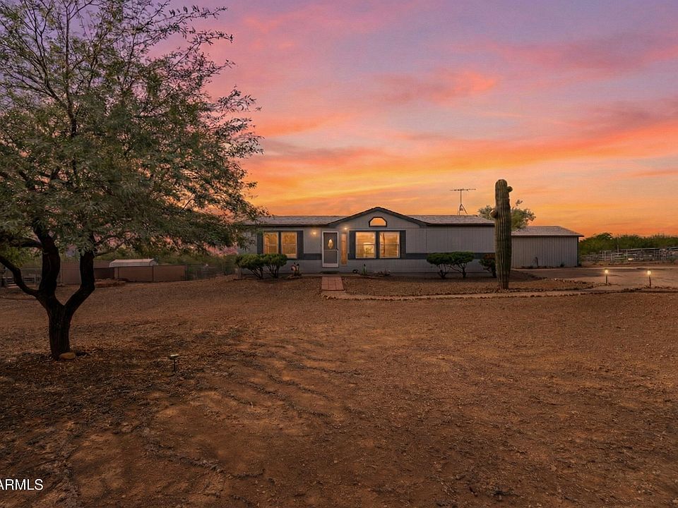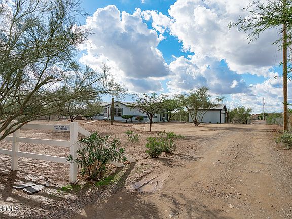 Beautifully updated 3-bed, 2-bath manufactured home on a full acre in Desert Hills. The vaulted living and dining area brings in abundant natural light, creating an open, comfortable feel throughout. Fresh interior and exterior paint and new flooring make the home truly move-in ready. Outside, the property offers a standalone 2-car garage plus a 1-car carport, providing ample storage and parking. With one acre to work with, there's room for outdoor living, gardens, or future improvements. The home is connected to reliable Cave Creek Water, an added benefit in the area. A well-maintained property with space, privacy, and potential.