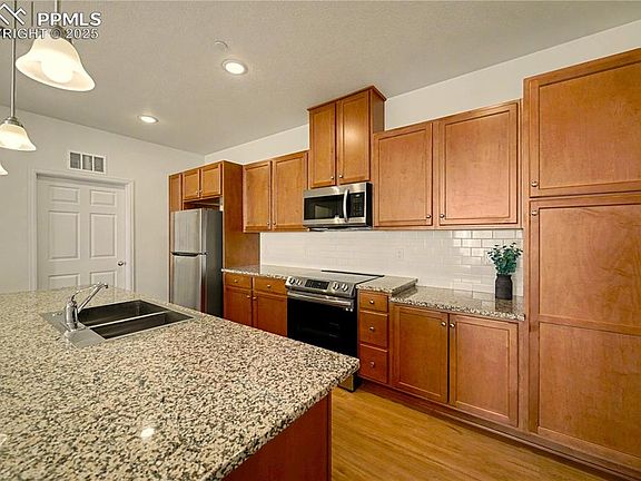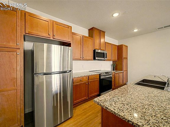 Location, Luxury, and Lifestyle! Location! Location! Location! This stunning condo offers the perfect blend of comfort and convenience — just 15 minutes from the Air Force Academy, 1 minute from UC Memorial and The Children's Hospital, and only 7 minutes to Pine Creek High School! Step inside to discover a spacious kitchen designed for both style and functionality, featuring ample cabinet space, a gas oven, stainless steel appliances, and a huge oversized island perfect for entertaining or casual dining. The open floorplan seamlessly connects the kitchen to the bright, inviting living room, which flows onto a private balcony through an oversized patio door — flooding the space with natural light and highlighting the gorgeous LVP flooring throughout. Retreat to your primary ensuite, complete with a large bedroom, spa-like bathroom featuring double vanities with granite countertops, a walk-in shower, and an expansive walk-in closet. A second bedroom, full bathroom, and a laundry room with washer and dryer included complete this beautiful unit — offering everything you need for effortless, modern living. This home offers an assigned parking space! Don’t miss this opportunity to live in one of the most desirable locations in town!