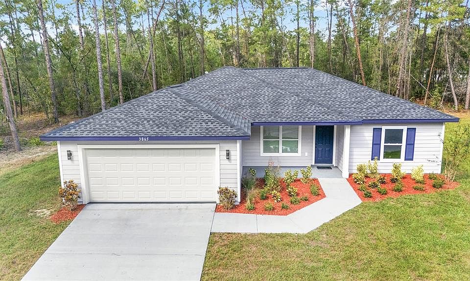 Under Construction. Introducing the Orchid III by Bakan Homes – A Modern New Construction on Nearly an Acre in Ocala! Experience contemporary living with this brand-new 3-bedroom, 2-bathroom home offering 1,576 sq ft of thoughtfully designed space on a .96-acre cul-de-sac lot just off Marion Oaks Lane. This modern residence features a full vinyl siding exterior and a welcoming front porch with a tongue-and-groove ceiling that adds subtle character to its clean lines and curb appeal. Inside, luxury vinyl waterproof flooring flows throughout the home, complemented by sleek black finishes and stylish black modern LED pendant lighting. The kitchen is a showpiece, boasting a massive 9-foot island, quartz countertops, solid wood soft-close cabinetry, and stainless steel appliances (including dishwasher)—perfect for everyday functionality and entertaining. The spacious primary suite offers a private 18x15 retreat with direct access to the rear patio and a spa-like bathroom featuring dual vanities, a rainfall shower, and recessed lighting. Two generously sized secondary bedrooms (13x11) provide flexibility for family, guests, or a home office. Your investment is backed by a limited Builder Warranty valid for one year from the issuance of the Certificate of Occupancy. Exterior photos are of actual site and interior photos are of a recently completed model and the subject home does not come with tile backsplash in the kitchen.. Colors, finishes, and appliances may vary from home to home. Estimated completion dates are only an estimate and can be delayed due to unforeseen circumstances.