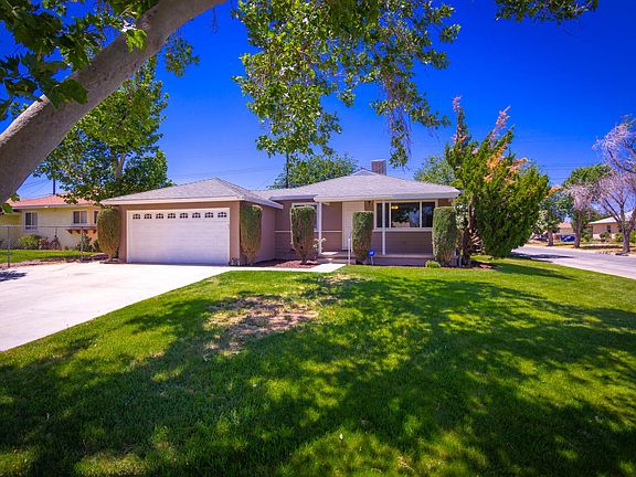 Cozy Palmdale home you don't want to miss out on! Beautifully upgraded and nice landscape in front yard, Brown exterior paint with Swiss Coffee Trim paint and modern Penthouse Gray interior paint. Cemented walkway leads to front porch entry. Enter into your living room- dining area which displays shag carpet; living room displays espresso ceiling fan and dining area displays brushed nickel 5-light chandelier. Dining area leads into kitchen which features 12" x 24" Travisano Trevi porcelain tile flooring, White cabinets with stainless steel modern hardware, modern square edge granite countertops, stainless under-mount double sink with brushed nickel pulldown faucet, and white appliances. Off kitchen you have laundry area with white cabinets for storage.