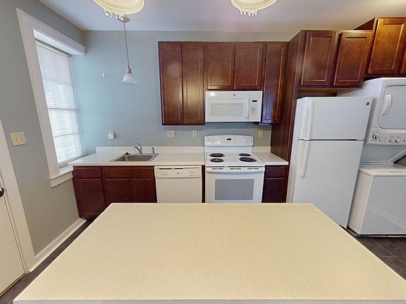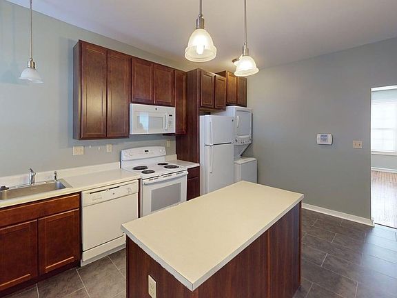 The modern kitchen is a standout, equipped with ample counter space, a center island, and a pantry for extra storage. Enjoy the full suite of appliances, including a refrigerator, range, dishwasher, microwave, and in-unit washer/dryer for maximum convenience.