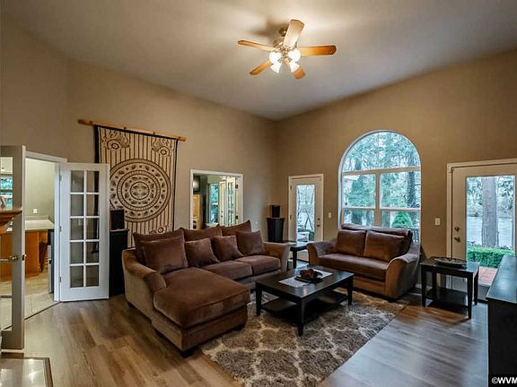 Accepted Offer with Contingencies. Stunning home on the Santiam River! Over an acre of water front property, covered outdoor entertaining patio & lush natural landscaping. Single-level, spacious 4 bed, 2 bath home comes with 2 gas fireplaces, AC, bright kitchen w/walk-in pantry, tall ceilings, all hard surface flooring. Your own fishing/camping along the river, undgrd sprinklers, room for RV/boat, and finished storage shed. 400 sf of bonus spaceabove garage for additional storage! Take a Tour!