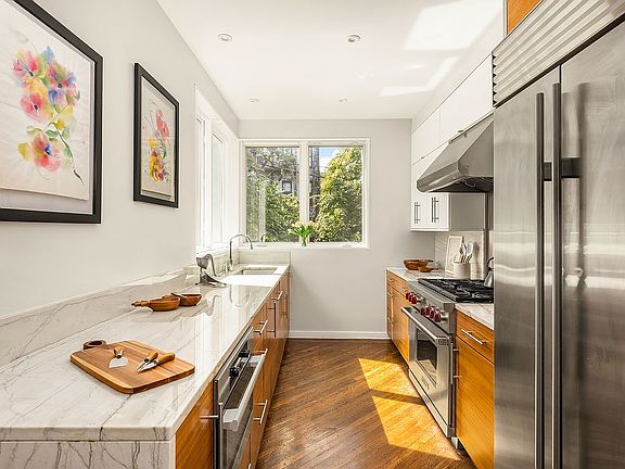 The gourmet chef’s kitchen is designed to inspire. It’s outfitted with a premium appliance package featuring a stainless-steel double-door Sub-Zero fridge, Wolf oven & gas stove, and a Miele microwave & dishwasher. Perhaps even more beautiful than the kitchen are the verdant views of the garden just beyond the window.