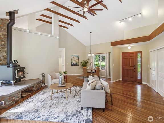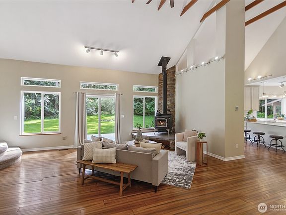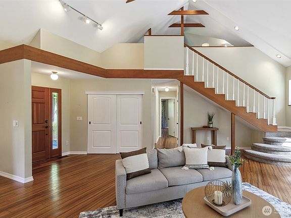 Tucked down a private lane discover this impressive, level sun-filled 3 acre property. This home has been tastefully updated to include a chef’s kitchen with a 5 burner gas top range and dual ovens, stainless appliances, large farmhouse sink, garden window and beautiful granite counter tops. Primary suite on the main level with access to the deck and hot tub. Expansive vaulted ceiling with custom woodwork. Large loft bedroom/bath with territorial views overlooking the property. 2 car garage with finished studio above. Enjoy the established landscaping from the greenhouse to the fenced pasture, small barn, and chicken coop. A rare find so close to Port Townsend and easy access to the Larry Scott Trail system.