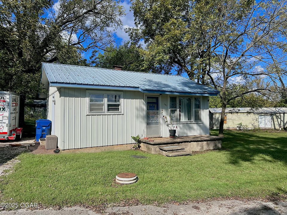 It's a 1 bedroom, 1 bathroom home that sits on a large lot that is full of shade trees. The metal roof and metal siding make it a smart choice for those looking for minimal maintenance.
