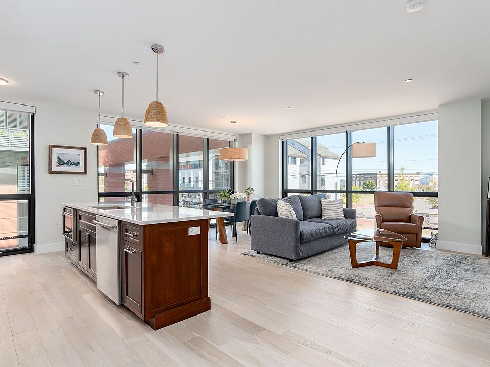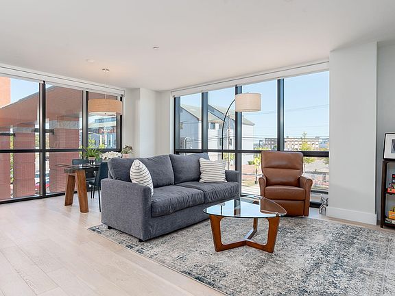 Stunning, sun-drenched corner unit with dramatic floor-to-ceiling glass. Pristine, two-bedroom, two-bath condominium in Hobson's Landing features a gorgeous kitchen with custom walnut cabinetry and crown molding. Gracious entry hall with plenty of storage, including a separate pantry. Ensuite primary bedroom with spacious walk-in closet, plus an ensuite guest bedroom. Motorized window treatments throughout. Deeded garage parking for two cars, including a private EV charging station. Building amenities include a lobby with concierge, club room with TV, deck, fireplace and full kitchen, landscaped terraces, fitness center, shared work/study space, dog wash, reservable guest suite, shared bikes and Tesla. Fabulous lifestyle in the midst of Portland's historic waterfront neighborhood!