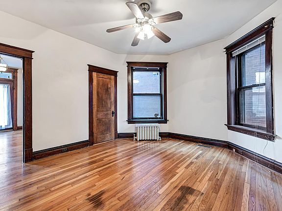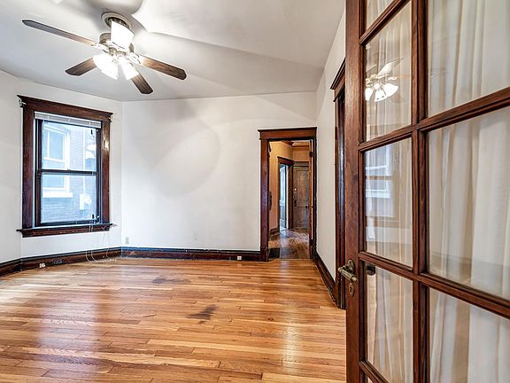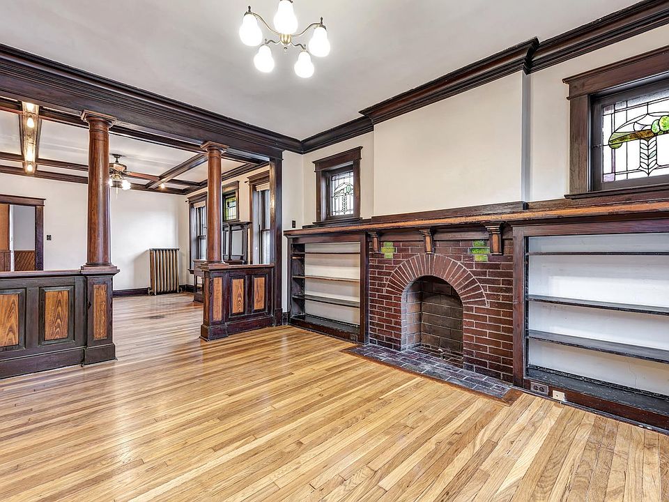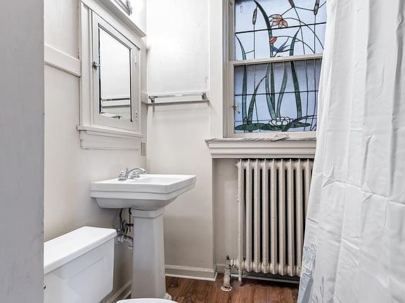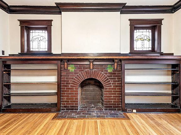 This charming apartment features original wood trim, pocket doors, and a decorative fireplace with built-in bookshelves and a dining room hutch. Enjoy a large eat-in kitchen with a dishwasher, updated flooring in the kitchen and bathroom, and hardwood floors throughout (with one carpeted bedroom). Ample storage includes large closets and dedicated basement storage.