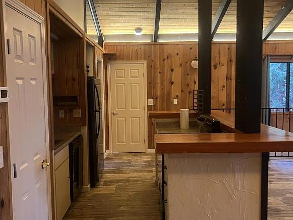 The kitchen has two pantries, along with a refrigerator and a dishwasher. There is an instant hot water heater.