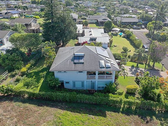 Located on the Garden Island of Kauai, this large single family home is centrally located in Kalaheo. It features a large covered Lanai with views to the West of the ocean, three (3) bedrooms and four(4) bathrooms. The upstairs and downstairs entrances are separate from one another and have a connecting staircase inside. The main kitchen is located upstairs and is an open area with vaulted ceiling; it looks out on the Lanai and has views of the ocean and sunsets as well. The two(2) upstairs bedrooms and the living room feature large sliding glass doors with the Master bedroom and Livingroom having access to the Lanai. Each area and room have ceiling fans installed. New windows have been installed through out the house. The property is landscaped with a tropical vegetation, an automatic irrigation system for ease of maintenance. Solar electricity which, includes a Net Energy Metering or NEM, to save on your electric utilities. The 80 gallon solar hot water unit supplies much of the house's hot water needs. Other features include; vaulted ceilings with ceiling fans, solar electric system that allows you to sell the excess solar electricity back to the grid provider, fully landscaped yards, 2 car garage with storage areas, external storm panel (bolts installed with covers), washer and dryer, central laundry area and a large down stairs living area with bar, sink and bathrooms.