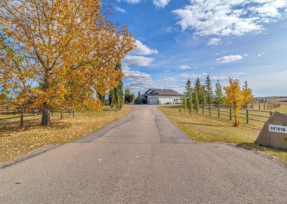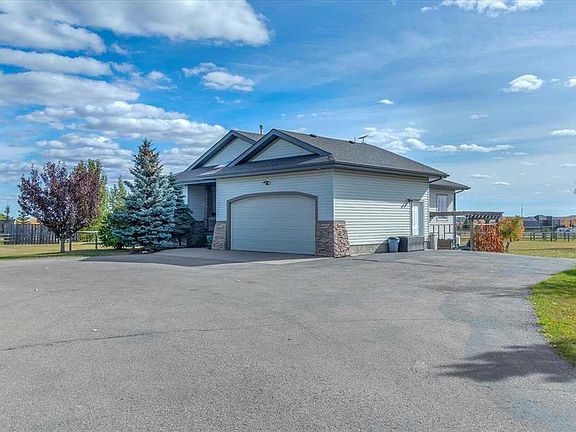 Step right into a world where rural serenity meets urban accessibility-just minutes to Okotoks! Nestled in a picturesque sub-division with southwest views including mountain views, this beautiful acreage is a haven for horse lovers and offers 4.25 acres which are fenced and cross fenced with post and rail fencing giving it a unique charm. This perfect setting features a walk-out bungalow with over 2500 sqft of developed living space in an open floorplan, vaulted ceilings, 2 beds up and 2 down, air conditioning and paved drive right to the front step. Along with a barn that comes with 2 stalls, a tack room, horse shelters and additional storage, this beautiful equestrian community is bordered by 8 acres of reserve and riding trails including 10m wide riding trails throughout the subdivision making this a dream location for equestrians and those looking for additional space. Inside, this welcoming home offers an open concept layout with vaulted ceilings, skylights that flood the home with natural light, a cozy fireplace and doors that lead out to the south facing deck from which to enjoy the breathtaking views of the foothills. The open kitchen, dining and living room are great for entertaining and the master bedroom with 5 pc ensuite and extra bedroom and 4 pc bath complete the main floor living space. You will appreciate the curved staircase that leads down into the bright walk out basement, featuring two bedrooms, 4 pc bath, in floor heating, a large family room with gas fireplace and a functional wet bar makes for another great space to entertain your family and friends. Outside, a private patio off the walkout basement provides a serene retreat, while on the west side you will find another extra patio area where you can soak in the sun and enjoy the mountains. The charming firepit area adds warmth and character to the outside space. You will find the perfect blend of outdoor living while close to Okotoks in this unique and beautiful space! (Private and public school buses come to the door)