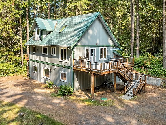 Charming A-frame style home on 5 wooded acres in South Whidbey! This private island retreat blends rustic charm w/modern comfort. Step inside to fir floors, detailed woodwork, a handmade stair rail & vaulted ceilings w/wood beams, open kitchen w/breakfast bar, dining room, primary bedroom & full bath. Upstairs bedroom w/ 3/4 bath & loft, great for home office. Lower level features a generous family room plumbed for a 2nd kitchen, full bath (new in 2020) & large bunk room ideal for gatherings. Enjoy outdoor living w/trails winding through the property & a fire pit for cozy evenings under the stars. Currently an active ST rental, this home is offered fully furnished, providing a rare turn key opportunity just minutes from the Clinton ferry!