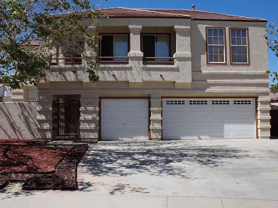 Spacious West Palmdale cul-de-sac home on a huge 10k+ square foot lot. Home is 2,202 square feet with 5 bedrooms, 3 bathrooms, bonus den, kitchen, breakfast nook, living room, dining room, family room, laundry room and 3 car garage. The large kitchen includes granite counters and back splash, glass kitchen cabinet doors, stainless steel dual sink and appliances as well as lots of extra cabinet storage space. Other features throughout the home include double door front entry with stone paver courtyard, remodeled bathrooms, vaulted ceilings, ceiling fans, house fan, fireplace with Travertine surround, tile and carpet flooring, master closet with built-ins, large wrap around balcony, backyard patio cover, garage storage and work-space. Located just a few minutes away from the Palmdale Amphitheater, Antelope Valley Mall and freeway access.