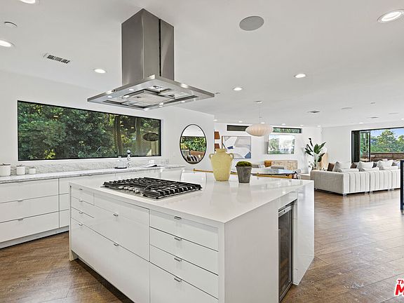 Nestled in the hills of Studio City, this stunning 4-bedroom, 5-bathroom contemporary ranch-style residence offers the ideal blend of elegance, comfort, and exceptional outdoor living. The open-concept design seamlessly connects the living room, dining room, and an entertainer's kitchen, complete with an expansive island and two built-in wine fridges. Every space flows effortlessly, making it perfect for both intimate gatherings and grand celebrations. The primary suite offers a serene retreat, while two spacious en-suite bedrooms, each with Fleetwood doors opening to the outdoor oasis, offer privacy and convenience. Downstairs, a fourth en-suite bedroom awaits, alongside a 750-square-foot four-car garage that doubles as a flexible space - whether a production office, music studio, or gym. Step outside into your private sanctuary, where custom accordion doors open up to mountain views, a deck with built-in barbecue, and an expansive entertainment area featuring a built-in bar, outdoor TV, and a 10-foot fire pit. The lush landscaping with succulents, sparkling pool, and spa create the perfect backdrop for sunny Southern California days.Situated on a rare 12,000-square-foot lot that spans street to street, this home combines tranquility with convenience, just moments from the vibrant shopping, dining, and entertainment that Studio City offers. Whether you're hosting unforgettable soires or enjoying quiet evenings by the pool, this property invites you to live the California dream.