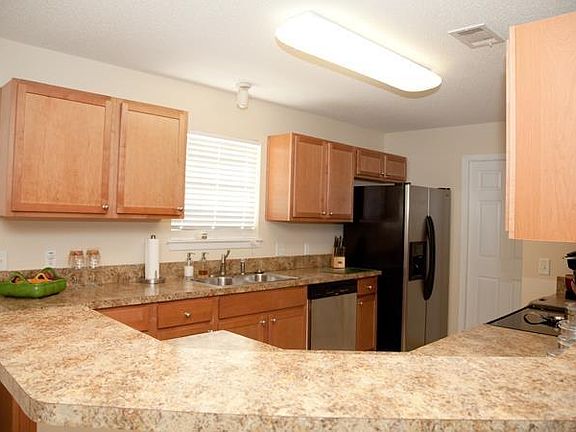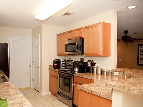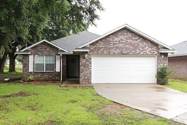 Attractive three bedroom, two bathroom brick home, located in Pace's Nevaeh's Cove. The open floorpan, is split with the master bedroom being separate from the guest rooms. The kitchen features stainless steel appliances and looks into the large living room. The spacious master bedroom leads into the master bathroom which is complete with dual sinks, a jetted tub, and separate shower. A covered porch at the back of the home overlooks the fenced backyard.