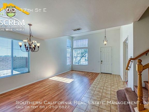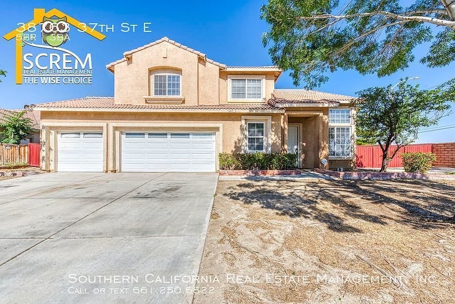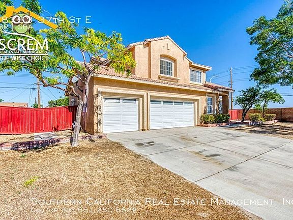 Spacious Palmdale home with five bedrooms, huge bonus room and office. Enter into the formal living room and dining room with cathedral ceilings and wood laminate flooring. The spacious kitchen has ceramic tile counter tops, a center island and recessed lighting. Kitchen appliances include: stove, dishwasher and microwave. The dining area off the kitchen has a French door leading to an enclosed patio, which leads to a large backyard with covered patio. The family room features wood laminate flooring with tile border and a gas fireplace. There is a small office off the entryway with wood laminate flooring. One downstairs bedroom and bathroom. The laundry room has built in cabinets with utility sink and leads to the three car garage. Huge bonus room upstairs with built in study desk. Three more guest bedrooms upstairs and full guest bathroom. Spacious master bedroom with two closets, one is a walk in. The master bathroom features double sinks, oval bathtub and separate shower. * Tenants will need to obtain Renters Insurance. Proof of insurance will be needed at lease signing. DO NOT DISTURB OCCUPANTS PRIVATE PROPERTY - NO TRESPASSING Application fee of $40 per applicant. Bonus Room Enclosed Patio Three Car Garage