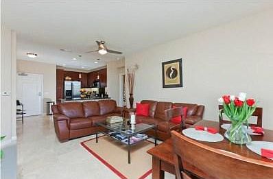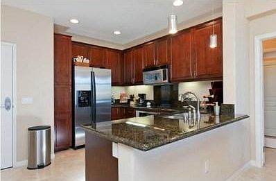 Stunning top floor unit in immaculate condition! $30K in upgrades incl. travertine floors, granite counters/back splashes, dark cherry cabinets, stainless steel appliances, marble surrounding bath. Dual masters with 2 large walk-in closets and 2 balconies. Large arched living room window and western exposure flood unit with natural light. Private, not facing into another unit.2 side by side parking spaces in garage next to very rare, large private storage unit. Short walk to shops, restaurants & Cinepolis