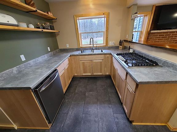 If you're looking for a beautifully remodeled home on a paved road in a rural setting this one is for you! 3 bedrooms, 1 bath, open living area boasts a remodeled kitchen with stainless steel appliances, leading to the open living/dining area with a gas log fireplace. The back entrance offers a concrete patio and the front entrance has a mudroom with laundry facilities. The large garage has a lean to for addition storage and a hot tub located behind the garage. Beyond that there is a wood boiler furnace and wood storage shed. The property is wooded and private and close to lots of trails. Call today to check it out!