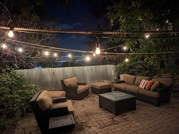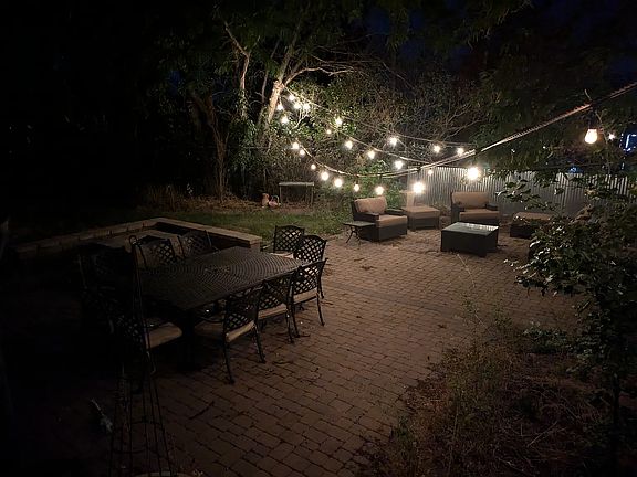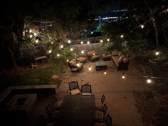 The fully landscaped yard includes a breathtaking patio with patio furniture, strung lighting, gas firepit, and grill.